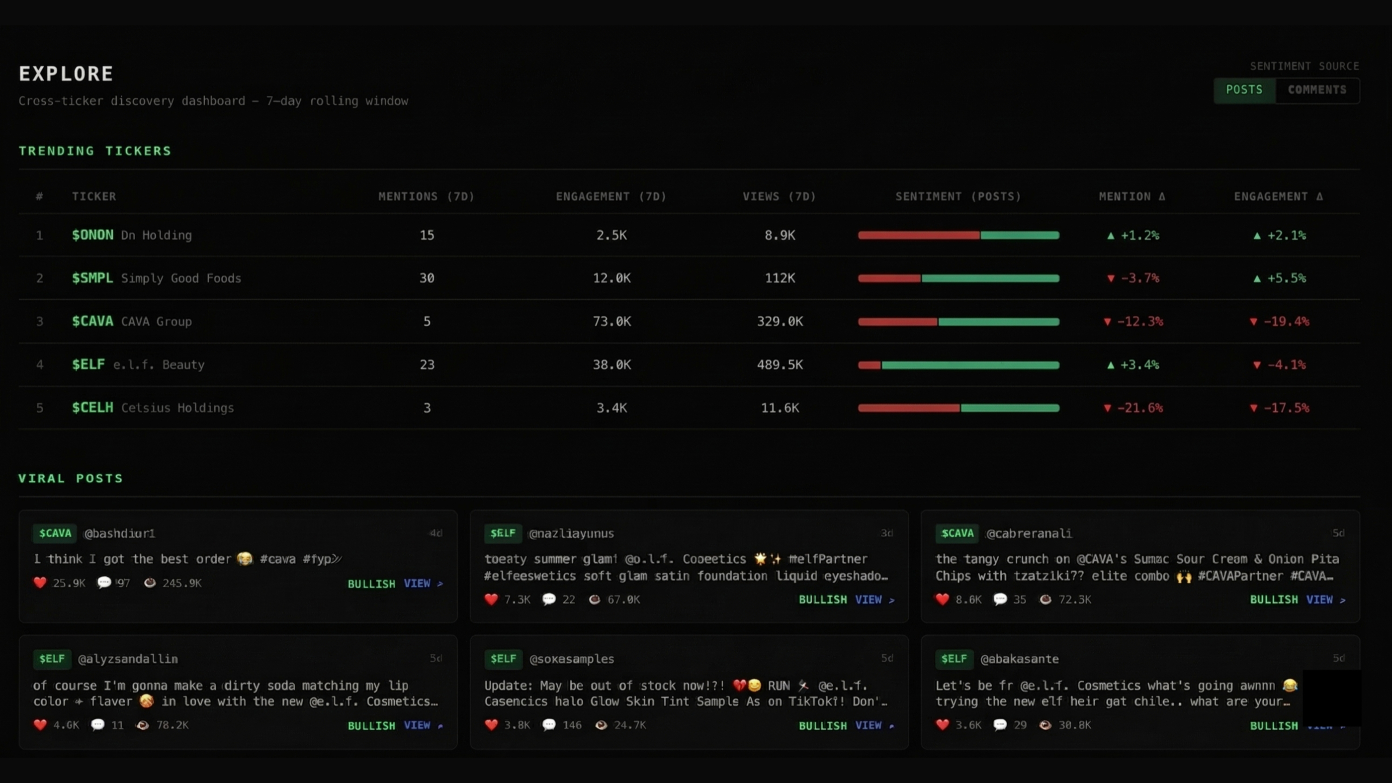 Cross-ticker discovery dashboard — see which consumer stocks are gaining social momentum right now.