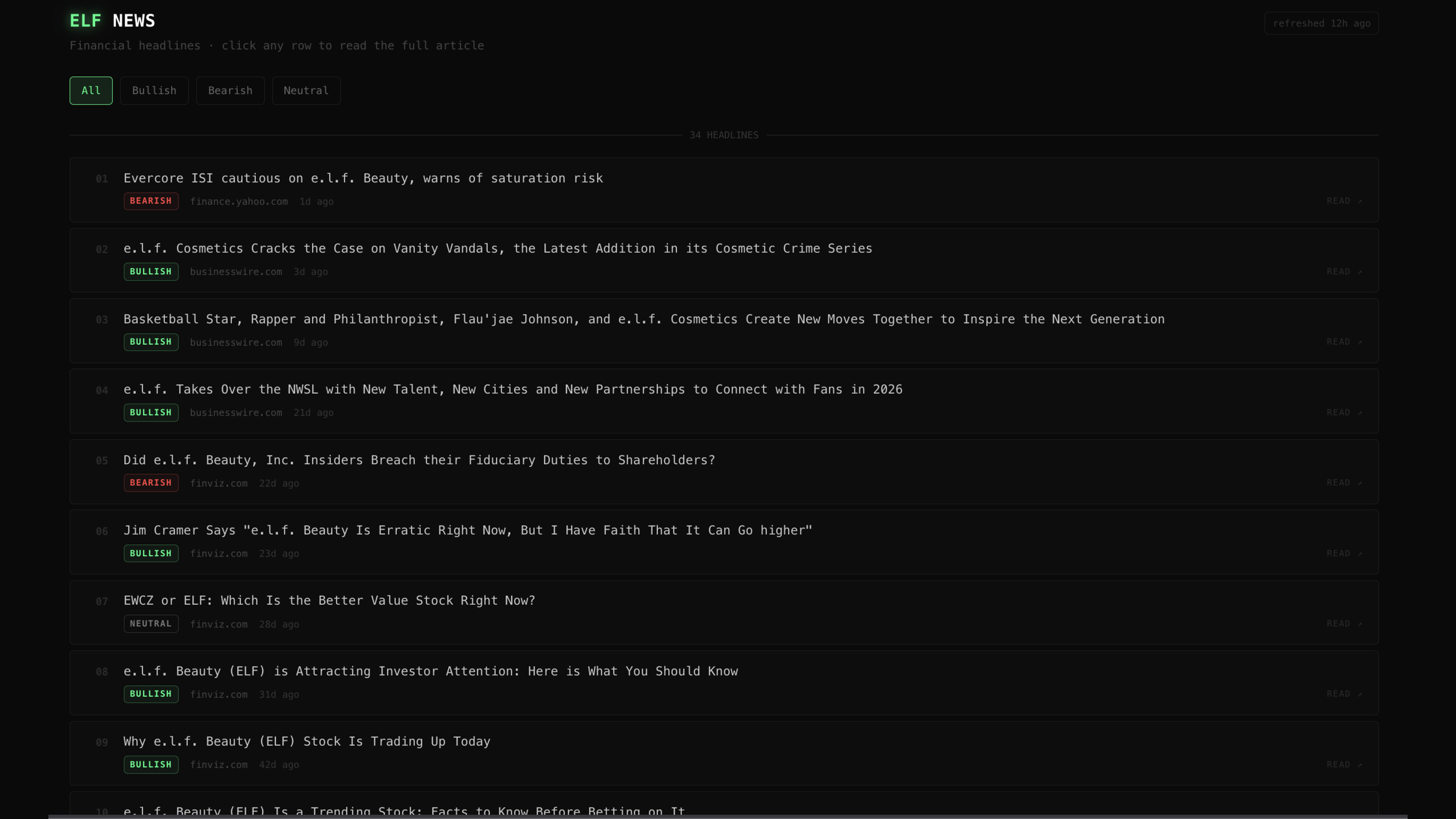 Major news outlet scraping across Bloomberg, Reuters, Finviz — AI-tagged headlines scored bullish, bearish, or neutral.